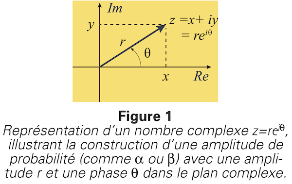 La section sur la mesure développera cette idée plus en profondeur. Mais voici le hic : \(\alpha\) et \(\beta\) ne sont pas des nombres ordinaires – ce sont des nombres complexes, ce qui signifie qu’ils ont à la fois une amplitude \(r,\) et une phase \(\theta,\) comme des vecteurs dans un plan (voir Figure 1).