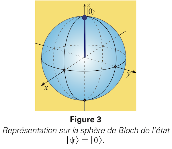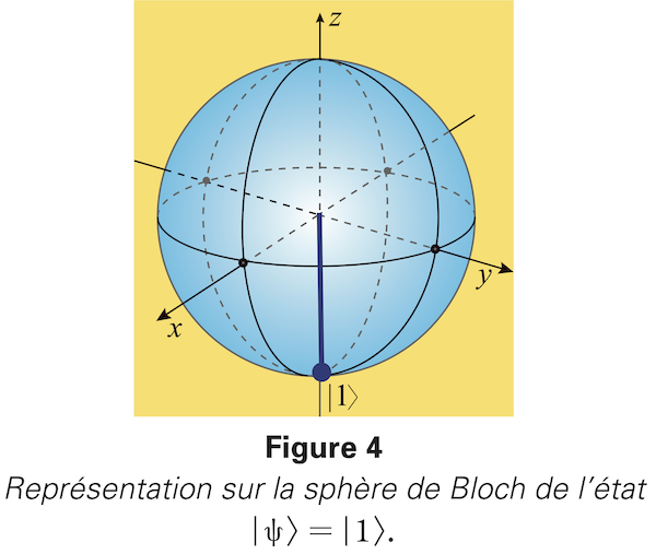 alors que l’état \(\ket{1},\) sera orienté vers le pôle sud (voir Figure 4).