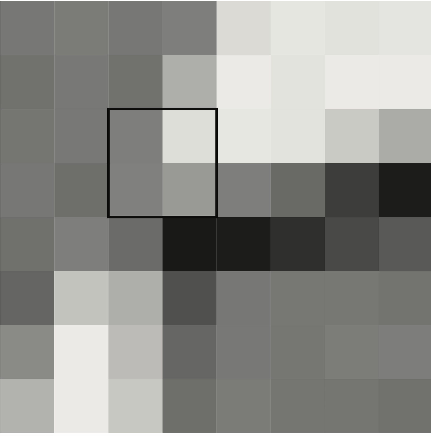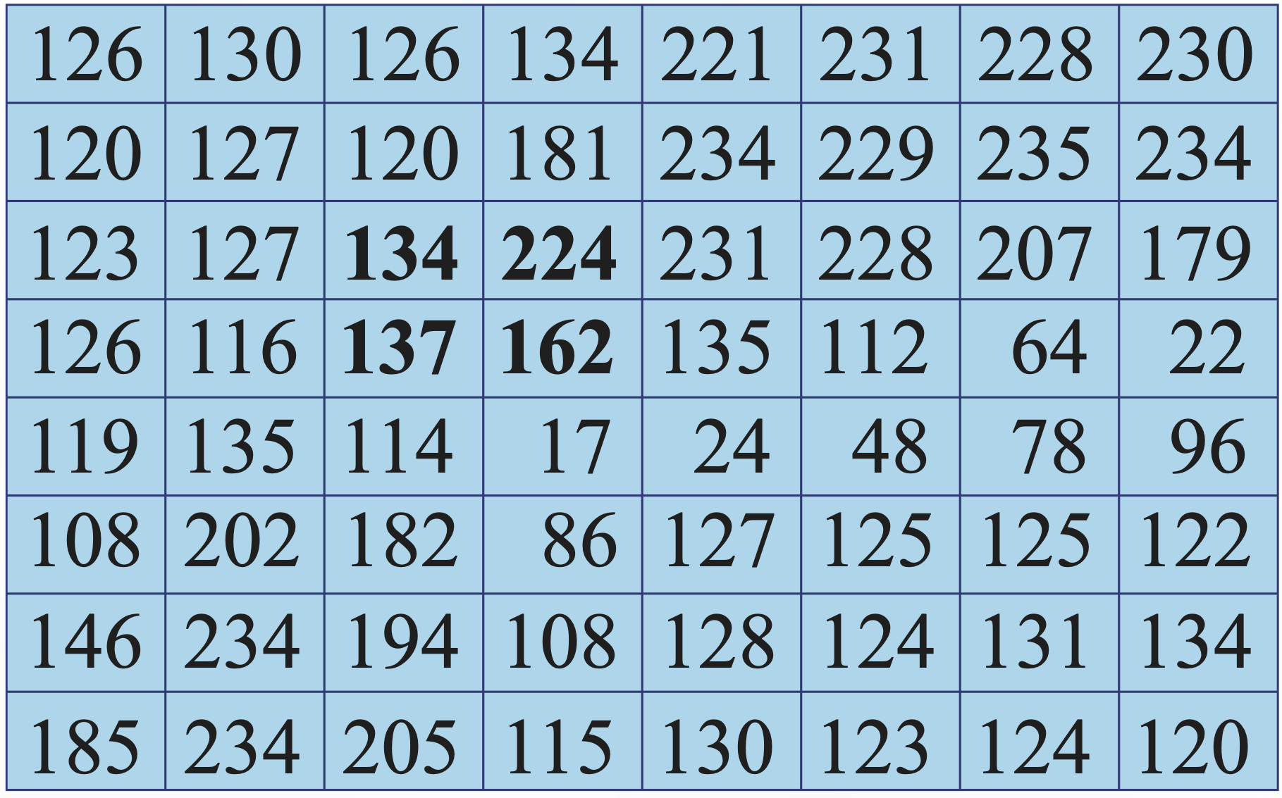 Regardons le carré \( 8 \times 8 \) ci-dessous : il représente les pixels 226 à 233 vers la droite et 216 à 223 vers le bas à partir du coin en haut à gauche de la photo. Sur ce carré on a mis en évidence un petit carré \( 2 \times 2 \) sur lequel on va suivre les transformations.