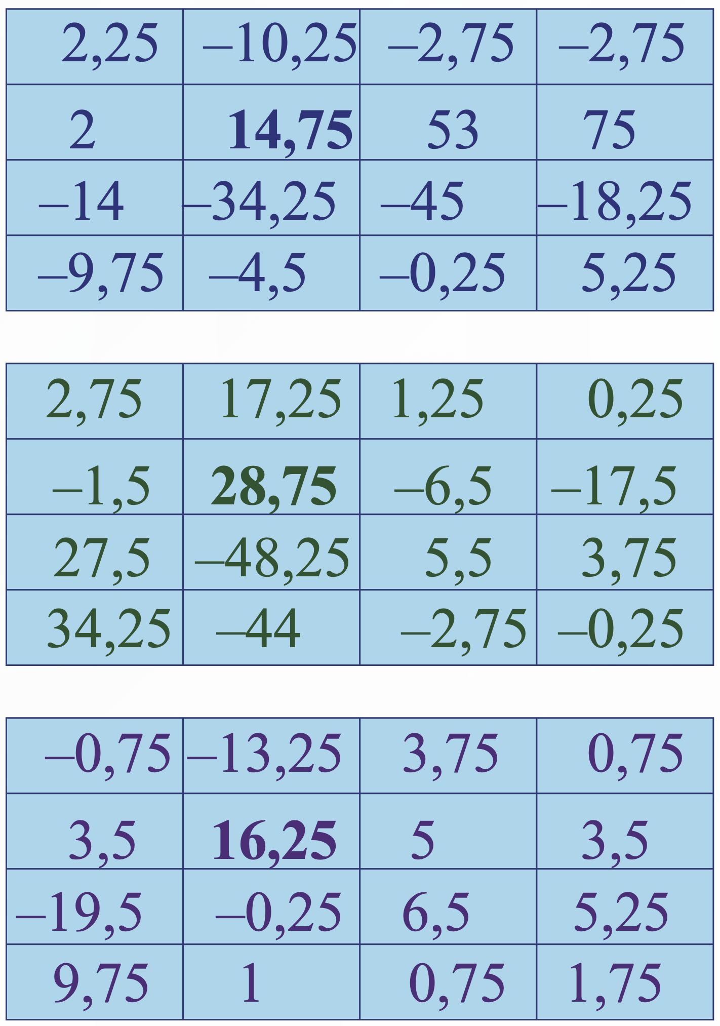 Faisons la même chose pour les carrés bleu, vert et violet, dont les valeurs sont données dans les tableaux suivants et les carrés correspondants ci-ci dessus.