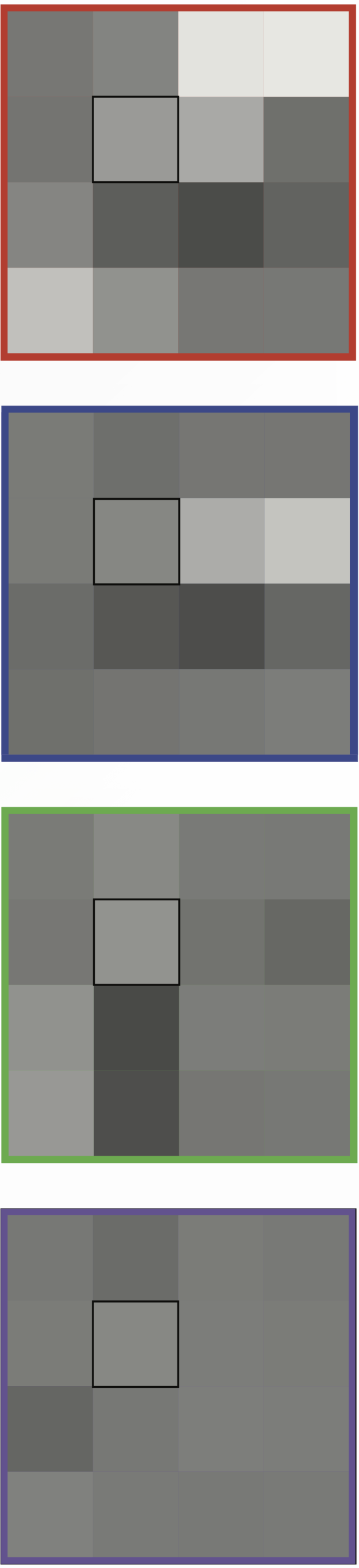 On ne peut comme tel visualiser les tableaux bleu, vert et violet car les entrées sont dans (–127,5; 127,5). Pour visualiser le contenu on va ajouter 127,5 à toutes les valeurs et les représenter (après arrondi) comme des tons de gris.