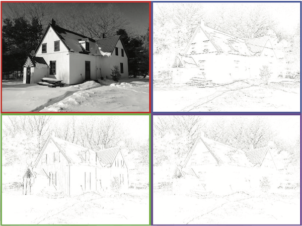 On voit bien que les rectangles bleu, vert et violet font ressortir les contours horizontaux, verticaux et obliques.