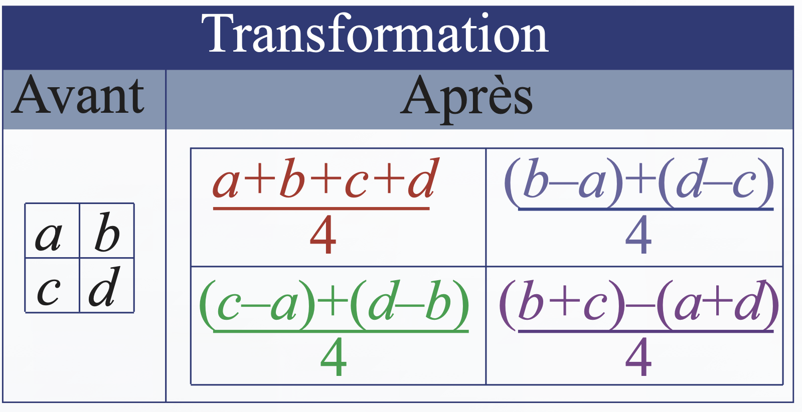 Les quatre tableaux contiennent toute l’information sur l’image, et de manière organisée.