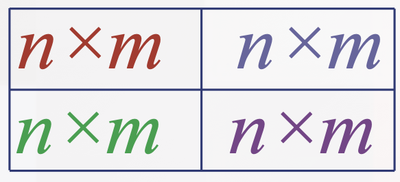 On va appliquer cela à un rectangle \( 2n \times 2m \) que l’on considère comme un rectangle formé de \(m\) rangées de \(n\) blocs \( 2 \times 2 \) et on va disposer les éléments rouges, bleus, verts et mauves dans des rectangles n×m disposés comme suit