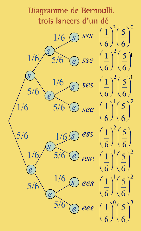 Ainsi, la probabilité d’obtenir un 6 deux fois en lançant un dé trois fois de suite est :