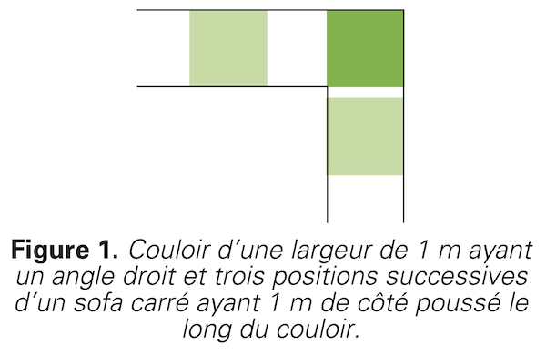 Un sofa doit être déplacé d’un bout à l’autre d’un couloir d’un mètre de largeur. S’il y a un angle droit le long du trajet, quelles sont la forme et l’aire du plus grand sofa que l’on puisse faire passer sans qu’il soit soulevé du sol ?