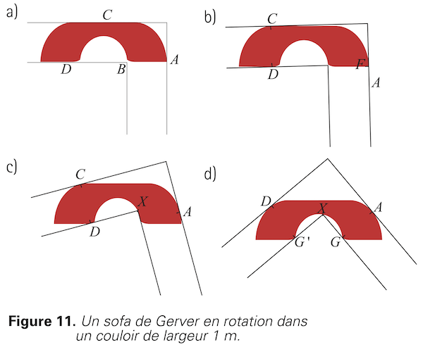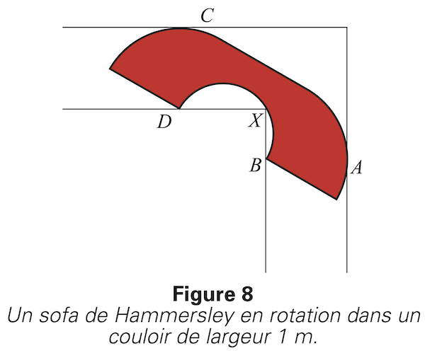 Observons que dès qu’il amorce le passage du coin, le sofa de Hammersley est tangent aux murs extérieurs A et C. En même temps, sa base touche les murs intérieurs B et D, ainsi que le coin X. Il n’y a donc aucune marge de manoeuvre pour agrandir le sofa sans changer sa forme.