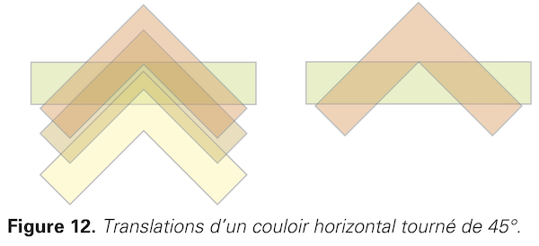 En effet, le sofa se trouve au départ dans la branche horizontale du couloir. Pour qu’il puisse tourner le coin de 45°, il doit être contenu dans l’intersection du couloir de largeur 1 et d’une translation du couloir tourné de 45°; voir figure 12.