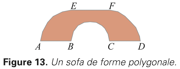 Un polygone est équilibré si, dès qu’il a des côtés parallèles dans une direction donnée, ceux-ci sont alors contenus dans exactement deux droites et si les sommes des longueurs sur chacune des droites sont égales. À titre d’exemple, le polygone de la figure 13, dont les sommets A, B, C, D, E, F sont en fait les coins du sofa de Hammersley, n’est pas équilibré. En effet, les segments AB et CD d’une part, et EF d’autre part sont situés sur deux droites parallèles. Cependant, la somme des longueurs des segments AB et CD est égale à 2, alors que la longueur du segment EF est \(4/π.\)