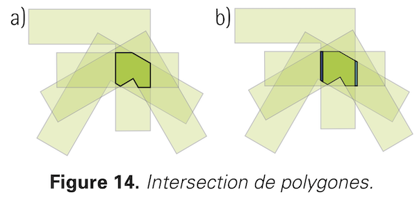 Sur la figure 14, le polygone intersection en a) n’est pas équilibré. En effet, considérons les deux côtés verticaux : le côté gauche est plus long que le droit. Comme les deux côtés sont parallèles, ils font partie d’une même branche d’un des couloirs. En déplaçant légèrement ce couloir vers la gauche, comme en b), on constate que la nouvelle aire est augmentée de l’aire d’un trapèze à gauche et diminuée de l’aire d’un trapèze à droite. Le trapèze côté gauche est plus haut que celui côté droit et les deux trapèzes ont même largeur. Ainsi, si la largeur est petite, le trapèze à gauche a une plus grande aire que celui à droite. Résultat : on a augmenté l’aire du polygone intersection en déplaçant un couloir vers la gauche.
