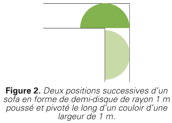 Considérons par exemple un sofa en forme de demi-disque de rayon 1 m, tel qu’illustré à la figure 2. Lorsqu’on le fait glisser à l’horizontale le long du couloir, il finit par toucher le mur du fond. À ce moment précis, le centre de son segment droit touche aussi l’angle droit du coin, tel qu’indiqué sur la figure 2. Il peut alors pivoter d’un quart de tour autour de ce point et poursuivre ensuite son chemin. Ce demi-disque a pour aire \(A = \pi/2 \approx 1,5708 \text{ m}^2,\) ce qui est déjà nettement mieux qu’avec le carré de \(1 \text{ m}^2.\)