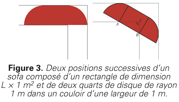 Remarquons que l’hypoténuse AB est de longueur L, quel que soit l’angle de rotation. En effet, les deux extrémités étant des quarts de disque, leurs points de tangence au couloir se situent à 1 mètre de A du côté gauche et à 1 mètre de B du côté droit. En particulier lorsque le sofa pivote en « roulant » le long des quarts de disque tout en restant tangent aux deux murs extérieurs, les points A et B parcourent les murs intérieurs du couloir, puisqu’il mesure 1 mètre de largeur.