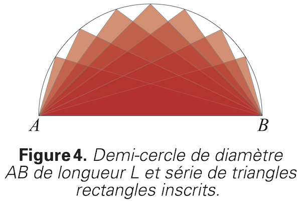 En plaçant le segment AB à l’horizontale, comme dans la figure 4, on peut plus facilement déterminer quelle est la réunion de tous les triangles ABC. Il s’agit tout simplement du demi-disque de diamètre AB puisqu’un angle inscrit dans un demi-cercle est un angle droit. Il en résulte le sofa de Hammersley, illustré à la figure 5.