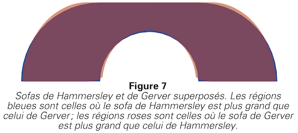 La figure 7 présente une image superposée des sofas de Hammersley et de Gerver. Pour passer du sofa de Hammersley au sofa de Gerver, il faut enlever les régions bleues et ajouter les régions roses. En y regardant de près, on constate que l’ensemble des régions bleues a une aire inférieure à l’ensemble des régions roses.
