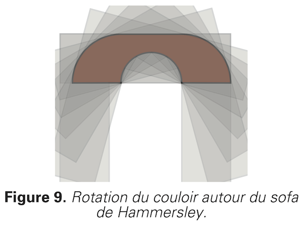 La figure 9 illustre la rotation du couloir autour du sofa de Hammersley. Quel que soit \(θ ∈[0; 90°],\) on fait tourner le couloir d’un angle \(θ\) et on le translate de telle sorte qu’il contienne le sofa. Ainsi, pour qu’un sofa ait une aire (localement) maximale, il faut qu’il corresponde à l’intersection de tous ces couloirs tournés et translatés. Sinon, on pourrait identifier une portion d’aire extérieure au sofa et incluse dans tous les couloirs. Cette portion pourrait alors être ajoutée au sofa pour en augmenter l’aire.