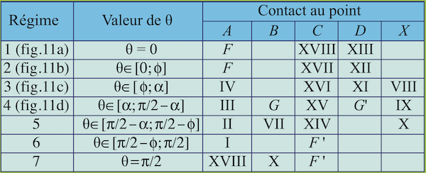 Tel qu’indiqué à la figure 10, la frontière du sofa comporte 18 portions de courbes et quatre coins \(F, F’, G, G’\) qui sont successivement en contact avec les murs du couloir pendant un intervalle de temps. Ces 22 morceaux sont liés par groupes de trois, quatre ou cinq, selon les contacts des quatre murs et du coin avec le sofa. On peut les présenter en ordre d’occurrence lorsque le sofa tourne dans le sens négatif d’un angle \(\theta \in [0; \pi/2],\) partant du couloir horizontal pour aboutir dans le couloir vertical. Deux angles sont utilisés pour donner les changements de régime