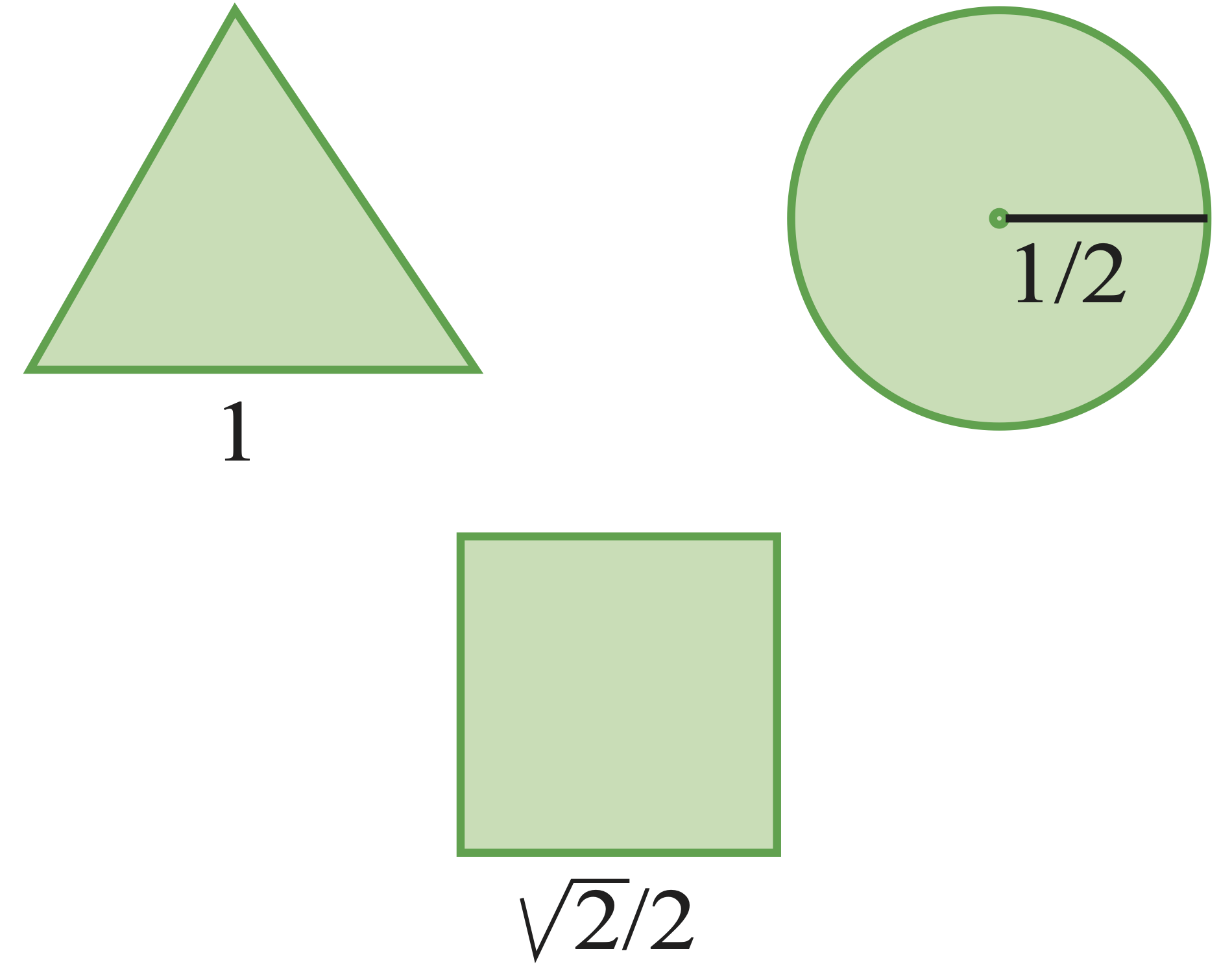 Pour ce problème, on va utiliser le terme diamètre pour représenter la distance maximale entre deux points de la forêt. Si la forêt a une forme circulaire, cela correspond à la définition usuelle du diamètre d’un cercle. Voici trois exemples de forêt avec un diamètre de 1.