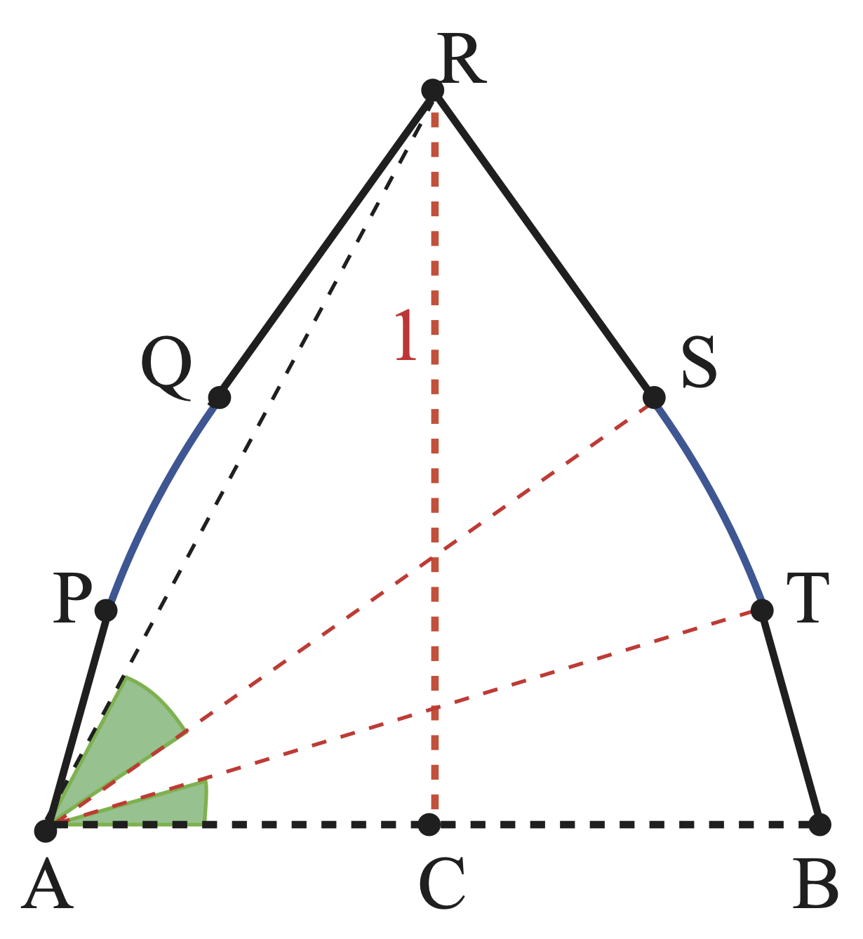 Pour le chemin de Zalgaller, il est formé de 4 segments \(AP, QR, RS\) et \(TB\) : et et de deux arcs de cercle \(\overset{\frown}{ST}\) et \(\overset{\frown}{PQ}.\)