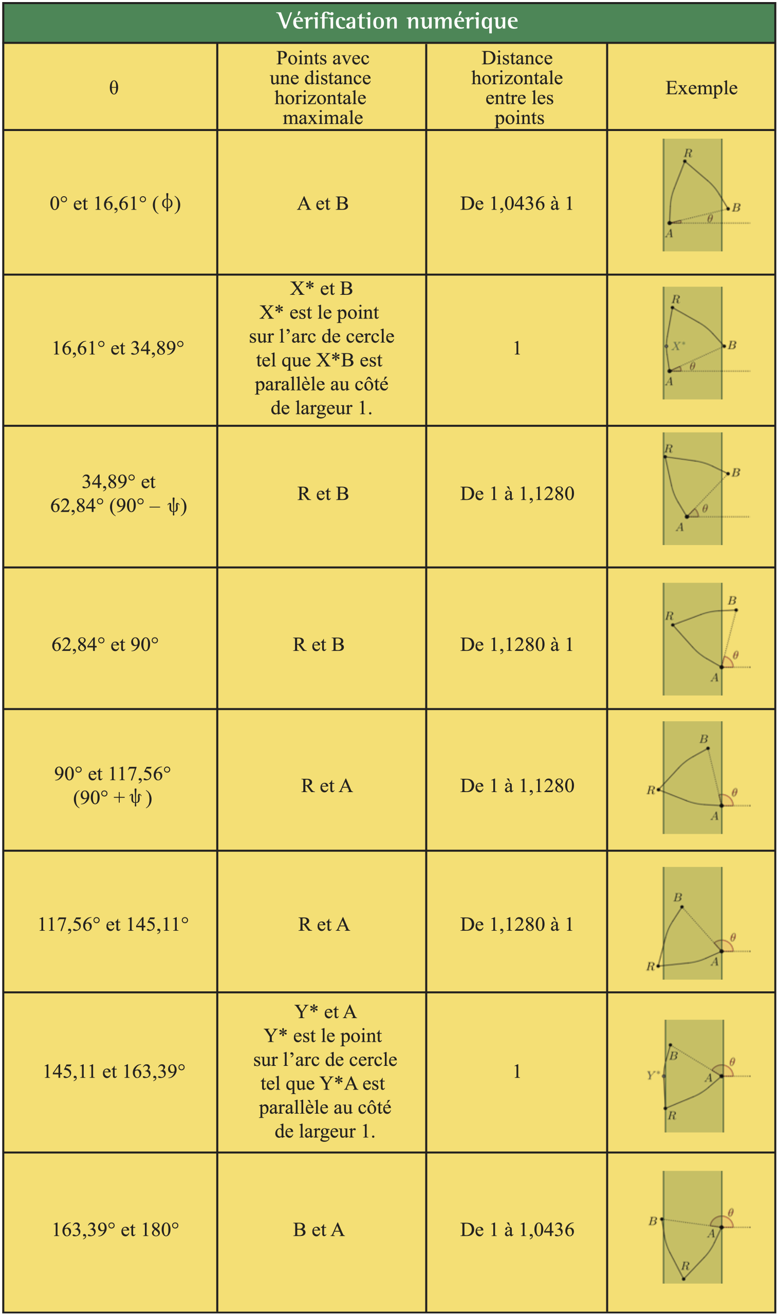 Le tableau de la page suivante donne, pour chaque intervalle d’angles \(\theta\) compris entre 0° et 180°, les deux points correspondants ainsi que leur distance horizontale.