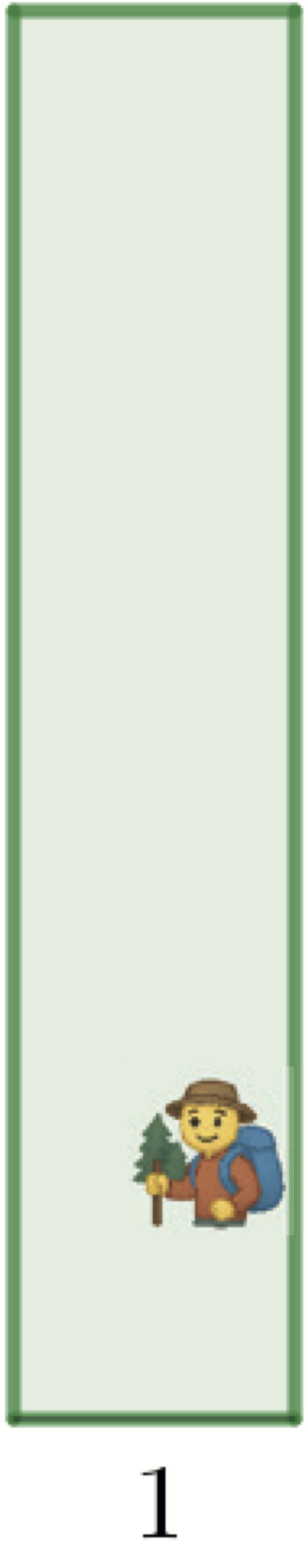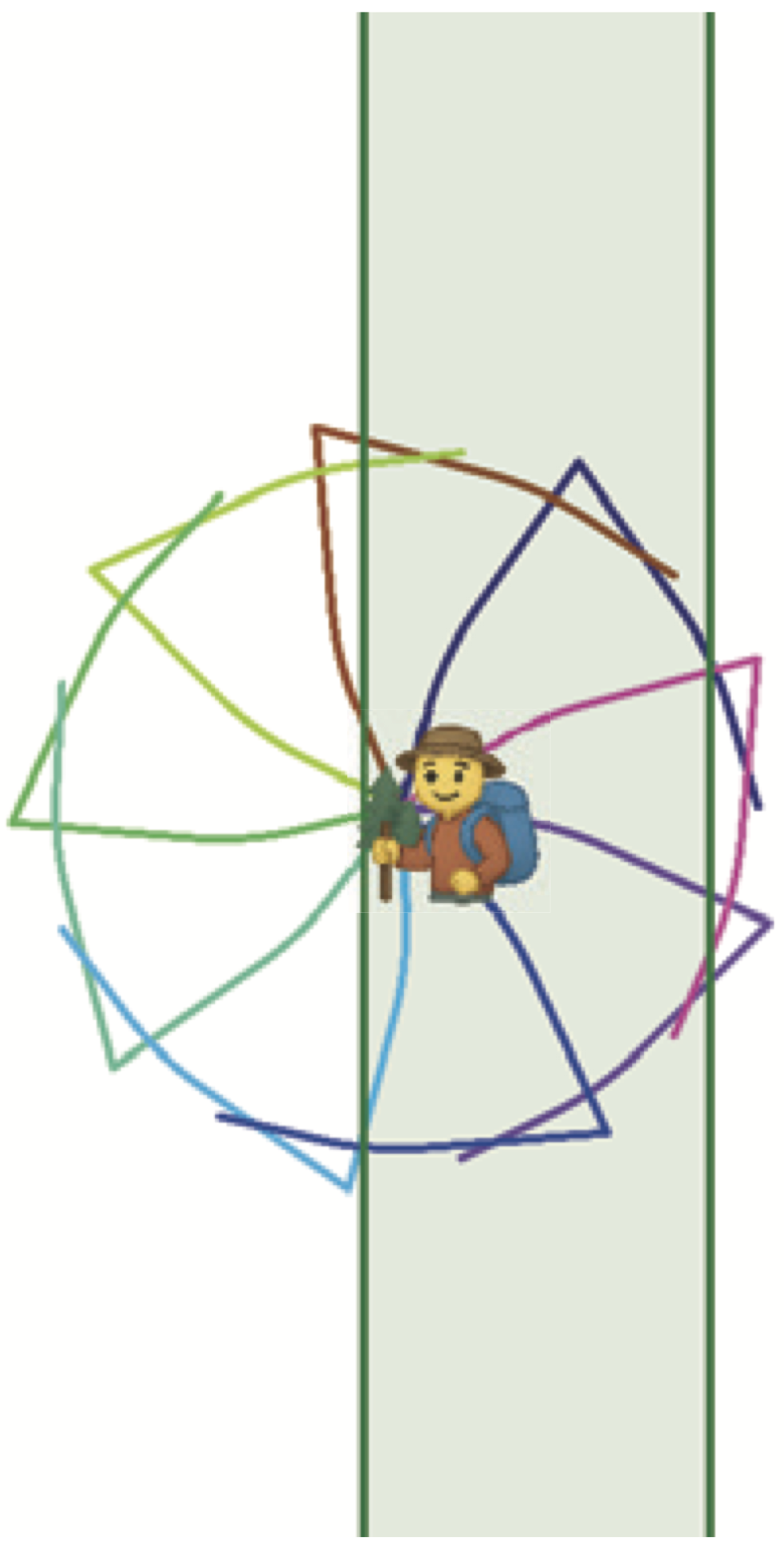 Pour vérifier qu’un chemin permettra toujours au randonneur de sortir de la forêt rectangulaire, il faut s’assurer qu’il existe toujours deux points sur le chemin entre lesquels la distance horizontale est au moins 1, et ce quelle que soit l’orientation du chemin dans la forêt.