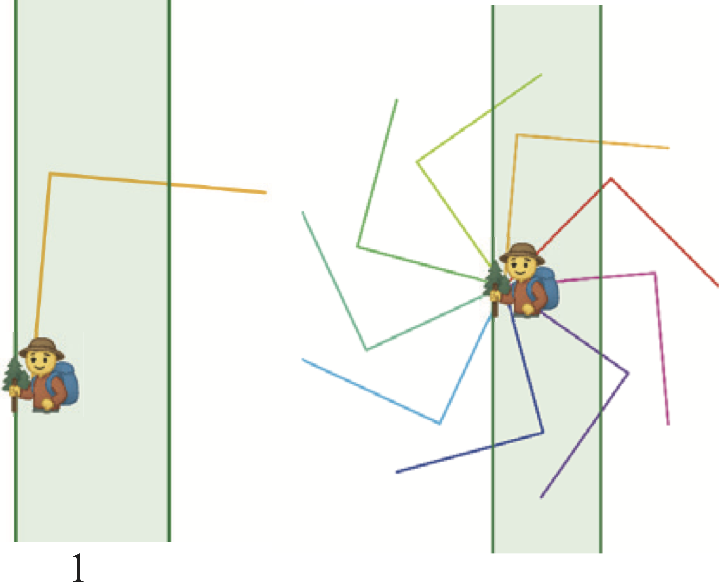 Ce problème du randonneur perdu dans la forêt est toujours étudié par les chercheurs. En 2025, Zhipeng Deng propose une nouvelle approche, à la place de déplacer le randonneur dans la forêt, il fait tourner et translater la forêt autour du randonneur.1