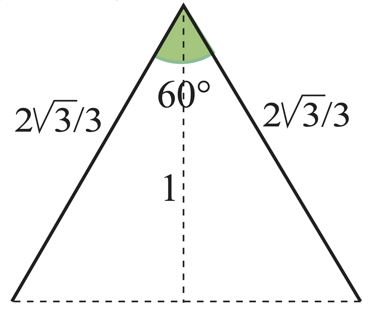 En 1965, Abraham Besicovitch trouve une meilleure stratégie que la ligne droite pour le cas de la forêt en triangle équilatéral. Un chemin en zigzag de trois segments permet au randonneur de sortir dans le pire cas après une distance d’environ 0,982. Ce chemin est composé de 3 segments de longueur \(\sqrt{3/28}\) et si on considère deux côtés consécutifs comme les côtés d’un triangle isocèle, la valeur des angles aigus est