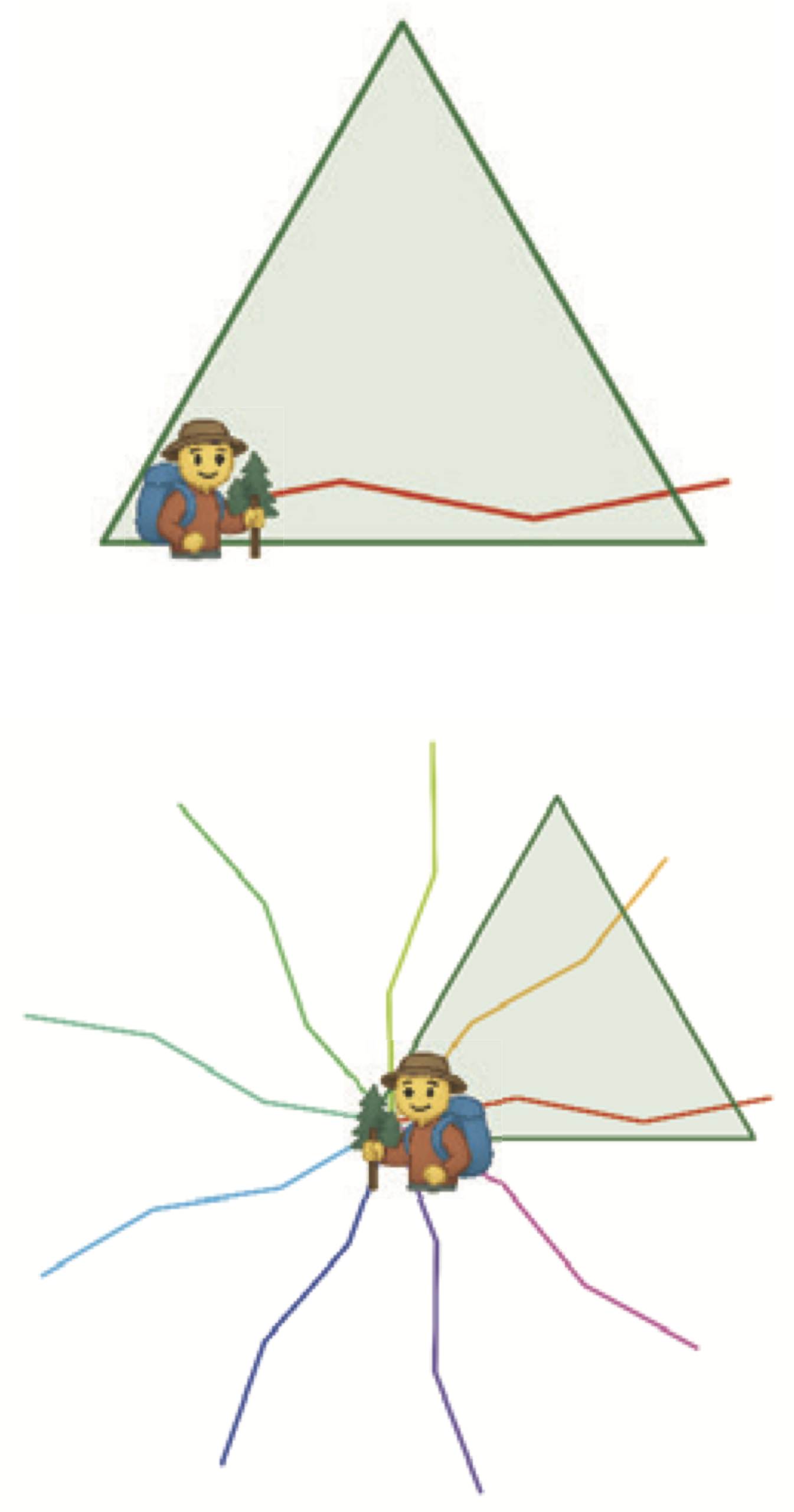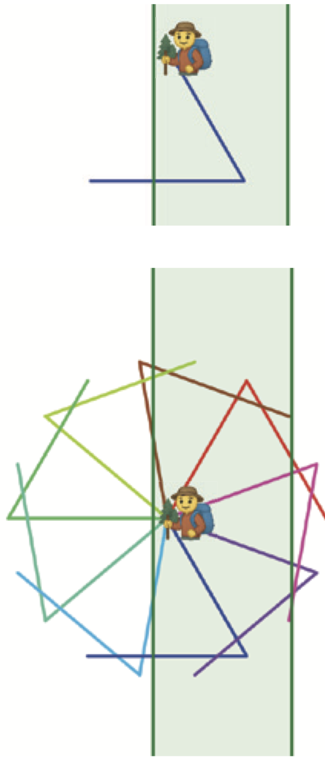 Ainsi quelle que soit l’orientation initiale du randonneur, l’un des sommets du triangle se trouvera nécessairement à l’extérieur de la forêt.